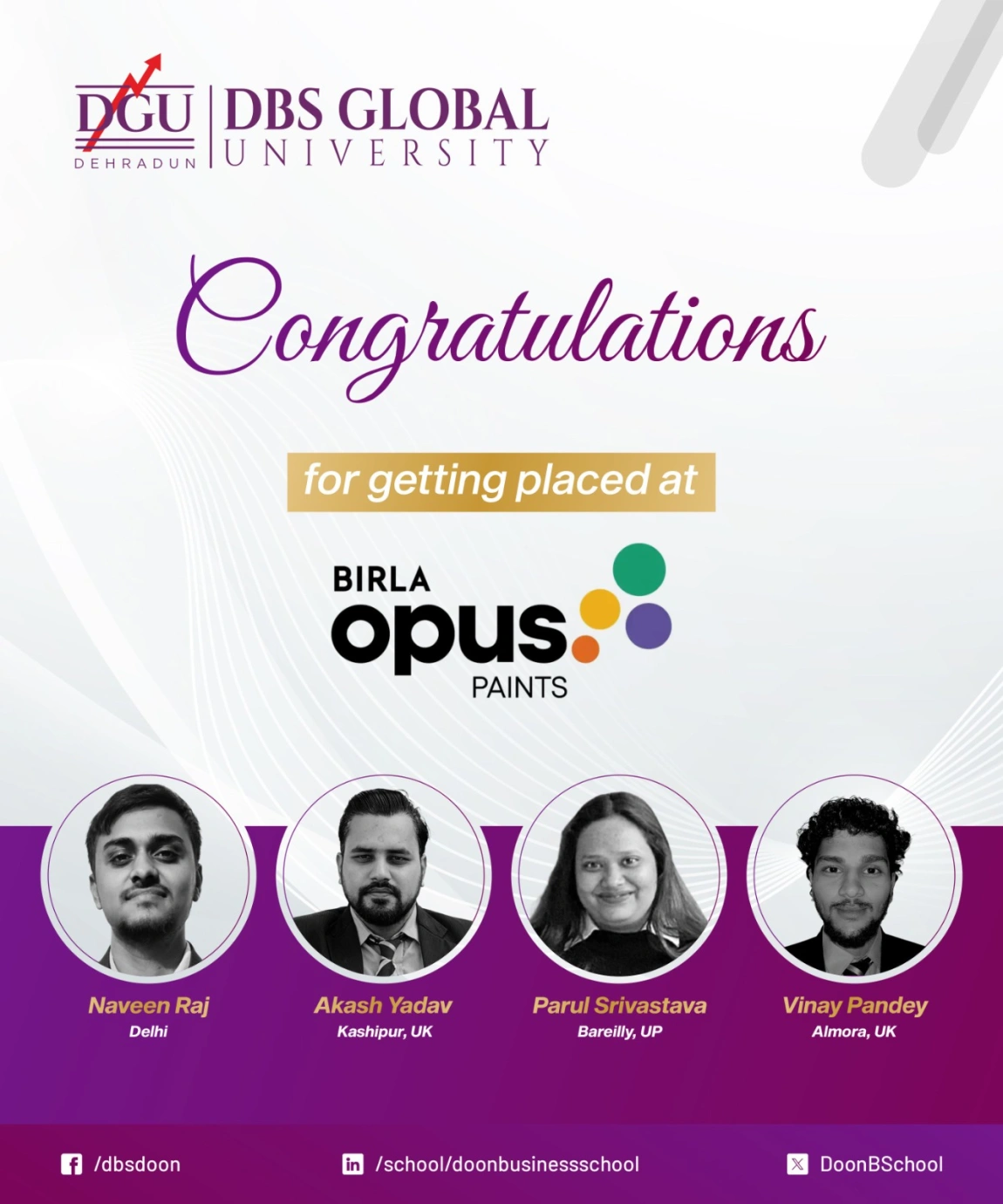 DBS Global University is proud to announce the successful placement of its MBA Marketing students at Birla Opus Paints. This achievement reflects the strong academic foundation, industry-aligned learning, and professional readiness developed during their journey at the university. The placed students include Naveen Raj, Parul Srivastava, Akash Yadav, and Vinay Pandey.